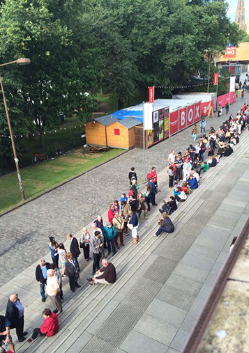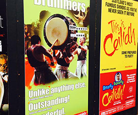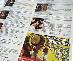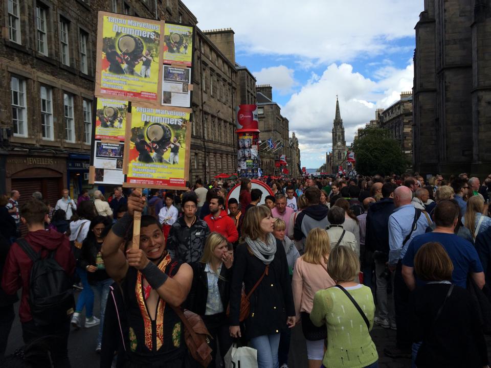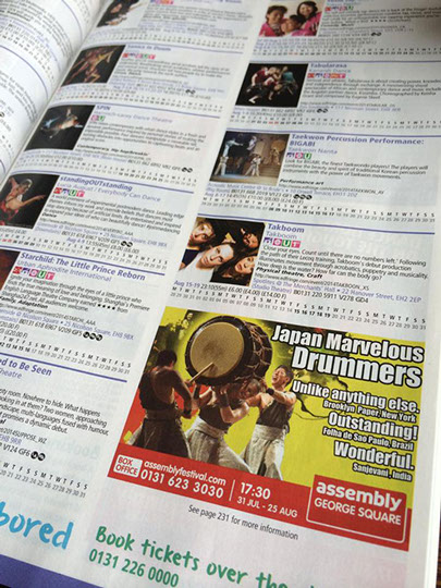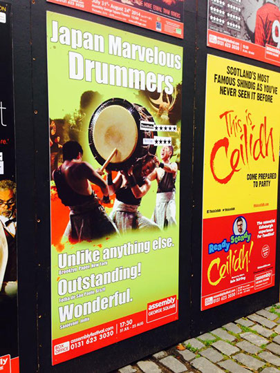 フリンジでは、沢山の会場で様々なショーが毎日行われており、それそれのフォーマーがショーを宣伝する為、街中には沢山の広告が張り出しています。またメインストリートでは各パフォーマーがショーのビラを配り、街を通る人々は夥しい数のビラを握っています。そんな中で、いかにしてマーベラスのショーに足を運んでもらうかが、公演の勝負所でもありました。幸いにして和楽団ジャパンマーベラスの広告はインパクトがあった為、初出場の初日は想像を超える入場数でした。また、公演を重ねる度にショーの評判が口コミで広がり、1週目にしてレビューアーより『フリンジ来たのであれば、このショーを見逃すと、日本のスペクタクルを感じる事は出来ないだろう。』と評価され、また、『彼らの表現する太鼓の迫力は凄く、また客席と一体となった楽しい舞台との融合は、パーフェクトなショーである。