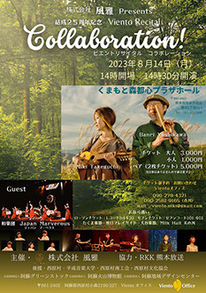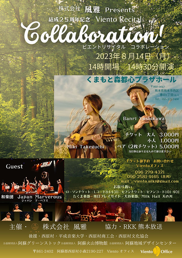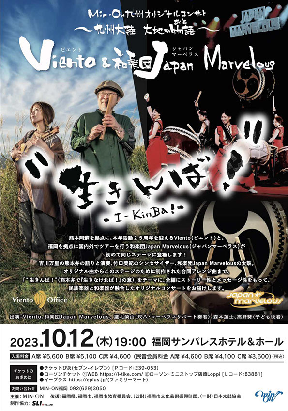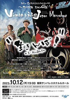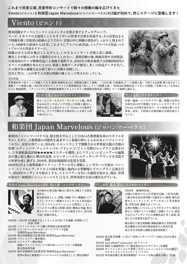 熊本阿蘇を拠点に、本年活動25周年を迎えるViento(ビエント)と、福岡を拠点に和太鼓、篠笛、尺八など和楽器での演奏活動を国内のみならず海外ツアーも精力的に行う和楽団Japan Marvelous(ジャパンマーベラス)が、初めて同じステージに立ち、オリジナルコンサートをお届けします。